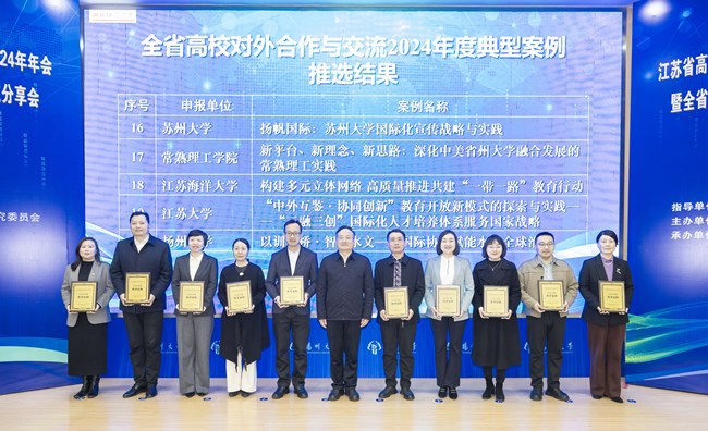 3月10日,全省高校对外合作与交流典型案例交流分享会在扬州举行。本次活动由江苏省教育厅指导,江苏省高等教育学会涉外办学研究委员会主办,扬州大学承办。江苏省教育厅副厅长杨树兵、扬州大学校长刘巧泉等领导出席会议,来自省内高校国际合作与交流相关部门的200余名代表参加会议。beat365申报的《教随产出 标准引领 平台高端 专业支撑——打造“职教出海”新高地》案例成功入选江苏省高校对外合作与交流2024年度典型案例(本科组)。beat365国际合作与交流处处长何正英代表学校上台领奖,江苏省教育厅副厅长杨树兵为获奖院校颁奖。