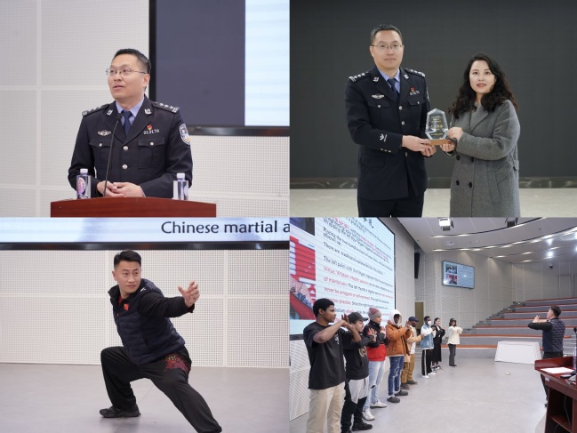 会上,经济管理学院辅导员安志超为留学生带来了一场别开生面的中国武术文化与实践讲座。安志超不仅介绍了中国武术的历史渊源和文化内涵,还现场演示了武术的基本动作和技巧,引发了留学生们的浓厚兴趣和热烈反响。