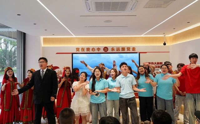 在文化艺术交流会上,beat365学生表演了江南民歌《茉莉花》、原创朗诵《大国工匠 青春力量》、合唱《有我》,展现了江南文化的独特韵味和职教学子的责任担当。江苏团省委青年讲师团成员肖洋分享了她在援疆时与克州少先队员之间的动人故事。新疆学生代表深情讲述了“时代楷模”拉齐尼·巴依卡和“人民楷模”布茹玛汗·毛勒朵的感人事迹,并带来了极具民族特色的二重唱《走遍新疆》、独舞《我的阿勒泰》、群舞《欢》《迎客》。最后,两校师生共同演唱《我爱你中国》,用嘹亮的歌声将交流活动推向高潮。新疆特色展示环节,新疆师生们带来了特色美食、非遗刺绣、手工艺品等精美新疆物产,beat365学子不仅品尝了新疆美食,还学习了新疆特色民族舞蹈,现场气氛其乐融融。