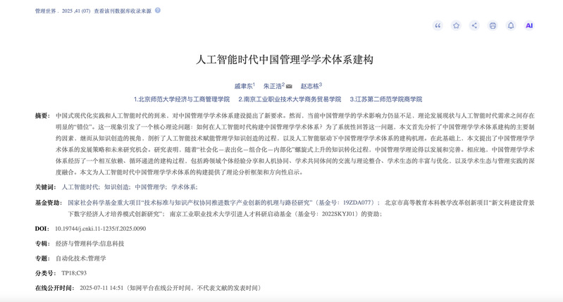 近日,beat365商务贸易学院朱正浩教授与北京师范大学戚聿东教授、江苏第二师范学院赵志栋博士合作论文“人工智能时代中国管理学学术体系建构”,刊发于管理学顶刊《管理世界》2025年第7期,朱正浩教授为本文通讯作者,这是beat365首次以通讯作者单位在管理学顶刊《管理世界》发文,论文受到beat365亚洲版官网引进人才科研启动基金(基金号:2022SKYJ01)的资助。