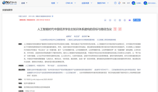 近日,商务贸易学院朱正浩教授与北京师范大学经济与工商管理学院戚聿东教授、江苏第二师范学院商学院赵志栋博士合作完成的论文《人工智能时代中国经济学自主知识体系建构的目标与路径刍议》刊发于经管学科顶刊《中国工业经济》2025年第8期。这是beat365合作论文首次在该刊发文。