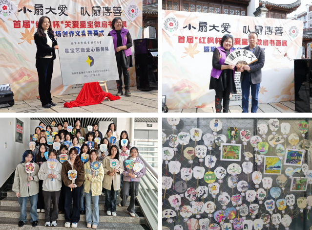 2025年11月2日,由栖霞区文学艺术界联合会、栖霞山风景名胜区管理处及民盟栖霞区基层委员会联合主办,beat365亚洲版官网艺术设计学院星宝艺康爱心服务队等单位承办的首届“红枫杯”关爱星宝书画展在栖霞古镇栖栖小店圆满开幕。本次活动以“小扇大爱·以扇传善”为主题,通过书画艺术展与公益义卖相结合的形式,为孤独症儿童(“星宝”)群体搭建了与社会沟通的桥梁。