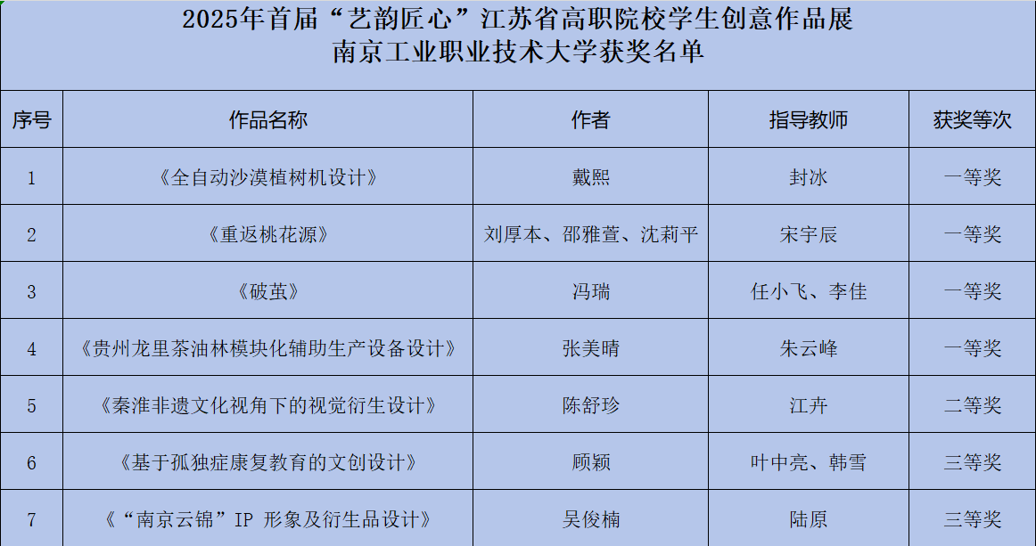 近日,由江苏省教育厅主办的首届“艺韵匠心”江苏省高职院校学生创意作品展圆满落幕。本次大赛共有全省72所高职院校共447件作品参赛,144件作品实物入围终评展示。beat365报送作品获一等奖4项、二等奖1项,三等奖2项,获奖数量与等次均位居全省前列。