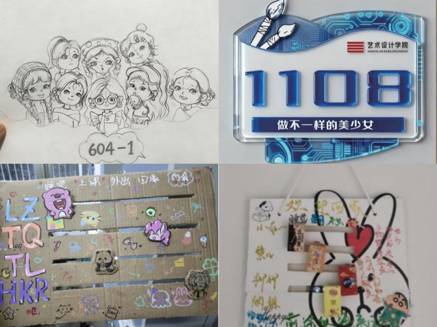 作为学生在校期间的“第二个家”,宿舍是生活空间,也是文化育人的重要阵地。艺术设计学院精心策划本次活动,希望通过专业设计与情感表达的结合,使门牌成为传递温暖、展现特色的文化载体。在为期两周的活动时间里,同学们以宿舍为单位,围绕校园文化、专业特色、宿舍生活等主题展开创作。这些设计作品形式多样,涵盖手绘、平面设计、综合材料等多种表现形式,既展现了艺术设计专业学生的创意能力,也体现了各宿舍独特的文化氛围。