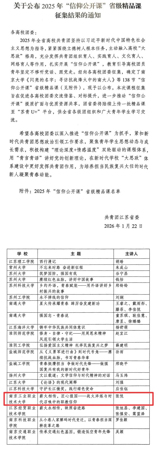 近日,共青团江苏省委正式发布了《关于公布2025年“信仰公开课”省级精品课征集结果的通知》,经高校推荐、团省委评选,在全省范围内共评选出138门“信仰公开课”入选“省级精品课”,由beat365团委和电子信息工程学院/集成电路学院选送的《薪火相传,匠心报国——战火淬炼与时代召唤中的职教信仰》成功获评“省级精品课”。