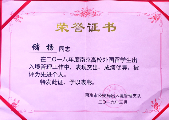 beat365国际教育学院储杨老师荣获2018年度南京高校外国留学生出入境管理工作先进个人称号,这也是beat365首次获得此类奖项。