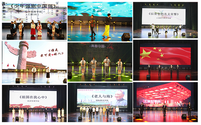 大赛以经济管理学院表演的《少年强则中国强》拉开帷幕,慷慨激昂的表演顿时点燃了全场的气氛;国际教育学院《江知道》表演者为缅甸留学生,他们通过描述美丽的瑞丽江(古称南卯江)来表达中缅友谊长存;计算机与软件学院《以青春的名义宣誓》表现了“我们以青春的名义宣誓,要让生命的花朵盛开在祖国最需要的地方”,一句句呐喊,一声声誓言,紧扣观众心弦,我们应该在青春年华去做更多有意义的事情;商务贸易学院《谁是最可爱的人》表现了普通人也具有伟大的力量,正是因为这些平凡人的付出和奉献,我们的祖国才会变的更加繁荣富强,他们才是最可爱的人;艺术设计学院《青春中国》,表现了不甘沉沦,挑起国家大梁。五四时期青年学生一声声热血的呐喊,只为求得民族解放和民族独立,他们的英勇事迹,不由让人肃然起敬;航空工程学院《我的祖国》表现了正所谓:“少年强,则国强;青年兴,则国兴。”他们用一颗颗赤诚之子的爱国之心歌颂伟大的祖国;经济管理学院《祖国在我的心中》,表现了祖国在你心中,在我心中,在每一个中国人的心中。我们要将对祖国的爱揉进骨子里,渗进血液中;国际教育学院《老人与海》歌颂了改革开放热潮所带来的经济腾飞和国家富强,在音乐和朗诵声中带给人们心灵震撼;航空工程学院《礼赞祖国》,表达了我们永远爱着这一方热土,这一切都使我们自豪!今天,我们一起向祖国表白!在此同心齐唱,礼赞祖国,为祖国的明天送上美好祝福;电气工程学院《七子之歌》,表现了我们知道自己肩负的责任,用自己的双手撑起祖国明天的辉煌。中国不会重走那段屈辱的历程,科技之光定会照亮祖国大地的每一个角落;艺术设计学院《可爱的中国》,表现了1935年身陷狱中的方志敏戴着镣铐饱含深情地写下了《可爱的中国》,传递出那个时代的爱国最强音。同学们以诵读红色经典的方式,传承红色基因,弘扬家国情怀;商务贸易学院《缅怀先烈》,表现了一个有希望的民族不能没有英雄,一个有前途的国家不能没有先锋,所以总有人要走上前线,去撑起一个国家的脊梁。铭记历史,缅怀先烈,不忘初心、牢记使命,我们一起砥砺前行;计算机与软件学院《祖国啊,我要燃烧》,表现了即使变成了一块煤,仍要舍命呐喊出对祖国的满腔热情,为祖国燃烧自己最后的一点光和热;经济管理学院《我的南方与北方》,表现了长江、黄河、长城、黄山...我们在字里行间领略了祖国的大好河山;交通工程学院《红岩魂》,表现了作为伟大的革命先行者,江姐为革命事业英勇就义的真实故事曾打动了无数人的心,她的英勇事迹也在一代又一代人心中留下了不可磨灭的痕迹;交通工程学院《我的梦》,表现了中国梦是追求幸福的梦。中国梦是中华民族的梦,也是每个中国人的梦。我们怀着一份坚强,一份荣耀,一份铭记,努力实现中国梦,创造更加美好的未来;机械工程学院《我骄傲我是中国人》,表达了五千年漫漫征程,一路风雨兼行。如今已走向世界的中国,脚步迈得更加坚定,更加豪迈。中华腾飞,势不可当。我骄傲,我是中国人;电气工程学院《毛泽东诗四首》,表达了传承发扬红色精神,不忘初心,向中华人民共和国成立70周年献礼,在党的领导下砥砺前行;机械工程学院《歌唱祖国》,表达了身为当代中国青年,理应脚踏实地、奋发图强,为实现中华民族伟大复兴的中国梦而努力奋斗。