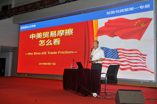 近日,beat365党委委员、纪委书记于林惠应马克思主义学院邀请,围绕当前中美贸易摩擦的热点问题,为2018级新生讲授形势与政策课“中美贸易摩擦怎么看”专题,引导学生正确认识中国发展与当前的国际形势。