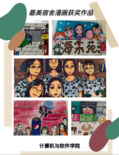 本次心理漫画展得到了同学们的积极响应,共收到作品40余件。同学们围绕“最美宿舍”主题,构思巧妙,思想积极,富有创意,充分展现了计算机与软件学院学生宿舍良好的人际氛围和大学生朝气蓬勃的青春气息。40余件参赛作品,有学生个体独自完成的,也有宿舍成员合作完成的;有单幅漫画,也有多格漫画,部分作品配有相关的文字说明。经全院同学以及宿舍管理阿姨的共同投票下,最终网络1913班漫画作品《军训掠影》获得一等奖,网络1911班漫画作品《星空舍友》,软件1913班漫画作品《宿舍一隅》分别获得二等奖,软件1921班漫画作品《加油246》,云算1911班漫画作品《安全宿舍》分别获得三等奖。其中《军训掠影》漫画描绘了身着军训服的同宿舍六位同学,甜美同框镜头,展现她们温馨的宿舍和深厚的友谊。《星空舍友》画面中是一片美丽的星空,星空下的朋友们在一起嬉笑玩耍,岁月静好,一切刚好。后期,这些优秀心理漫画作品将被装饰,在敬业楼计算机与软件学院橱窗上展示,供全院师生观赏。