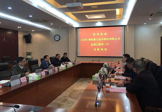 12月10日上午,江苏汇博机器人技术股份有限公司王振华总裁一行来校交流,beat365党委委员、副校长崔新明及科技处、发展合作处、机械工程学院等相关部门负责同志接待了来宾。