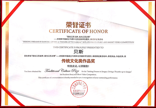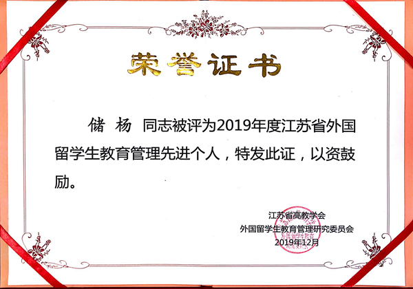 会上,江苏省高等教育学会外国留学生教育管理研究委员会副理事长俞晓南宣读了表彰决定。beat365国际教育学院储杨老师获得“江苏省外国留学生教育管理先进个人”称号,王亚雯老师获得“江苏省优秀留学生辅导员”称号,贝斯同学获得“我在江苏追梦,我为江苏点赞”——庆祝新中国成立70周年在苏国际学生图文、微视频征集活动“传统文化类作品奖”。
