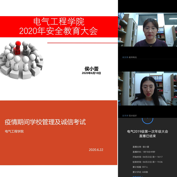 6月23日晚,电气工程学院召开线上安全教育和诚信考试教育大会,此次大会为2019级学生的第一次年级会,会议由辅导员侯小蕾和史雪冰主讲,2019级594名学生参加了会议。