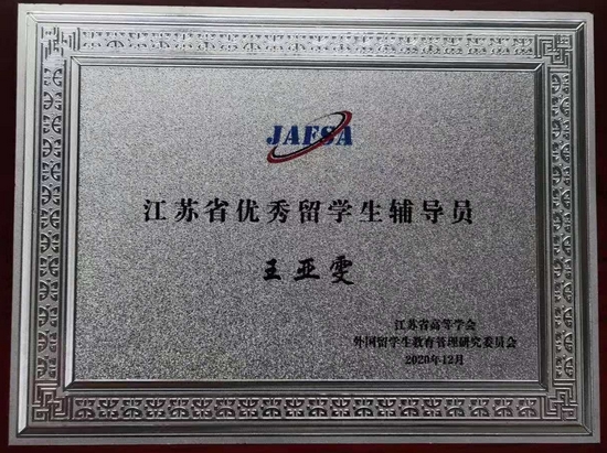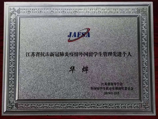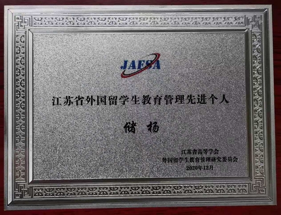 4月9日,江苏省高等教育学会外国留学生教育管理研究委员会2020年年会在常州大学召开。beat365国际教育学院华烨获江苏省抗击新冠肺炎疫情外国留学生管理先进个人称号,储杨获江苏省外国留学生教育管理先进个人称号,王亚雯获江苏省优秀留学生辅导员称号。