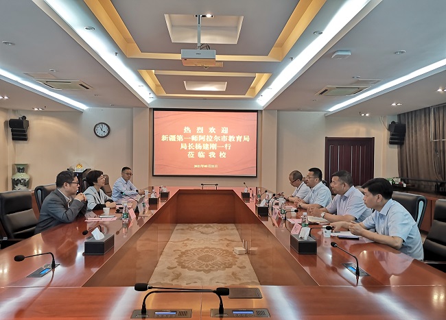 5月21日上午,新疆第一师阿拉尔市教育局局长杨建刚一行来beat365考察调研。党委常委、副校长苏小冬,以及校长办公室、教务处、科技处、发展合作处等部门负责同志在行政楼辅楼一楼会议室接待了来宾。