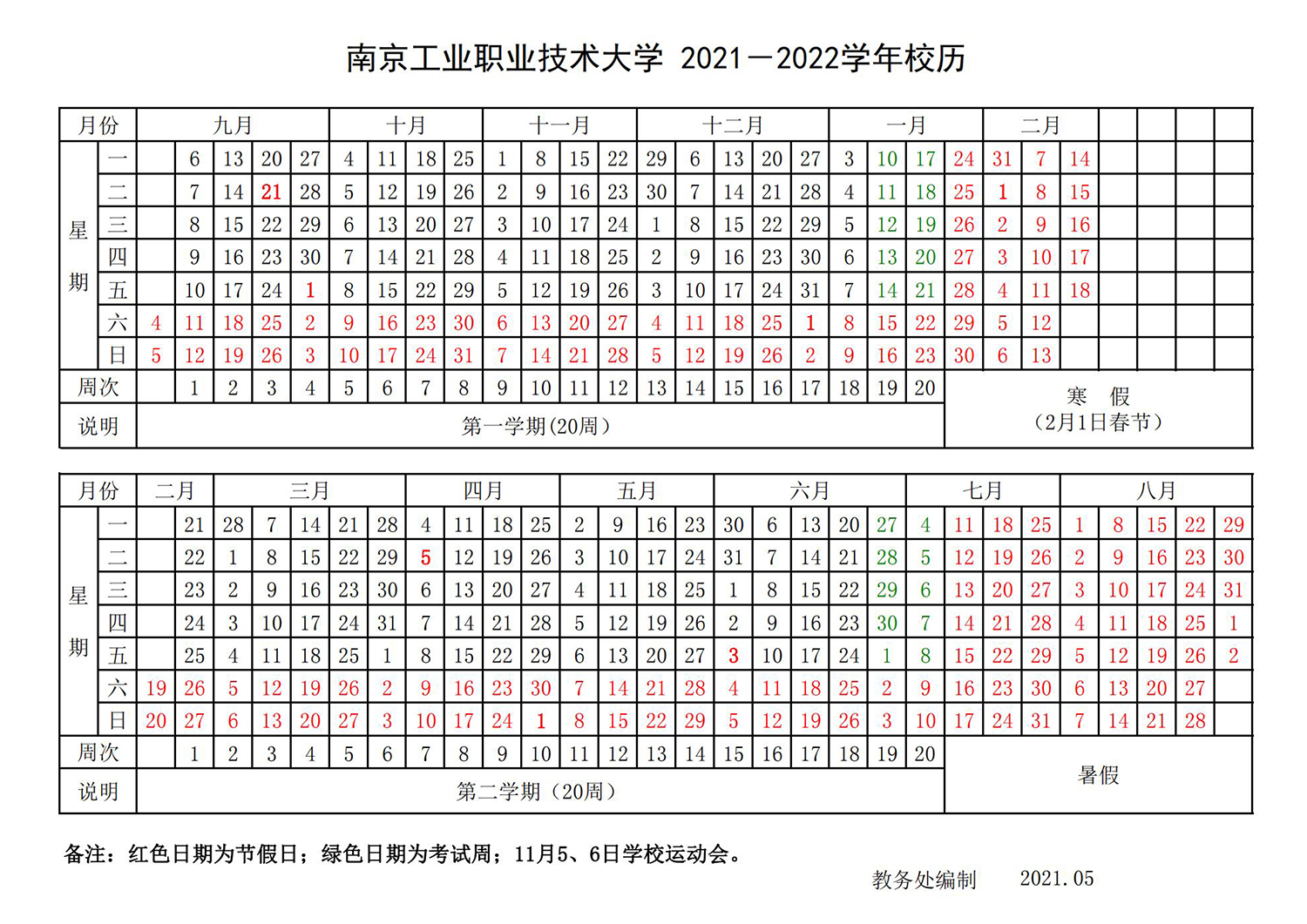 2021-2022学年校历