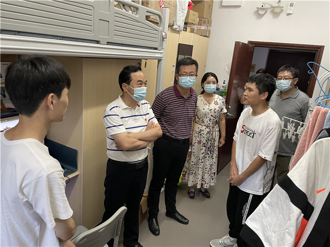 10月9日,校党委书记吴学敏、党委常委、副校长崔新明专程来到学校天堂校区,关心和视察艺术设计学院学生返校工作。