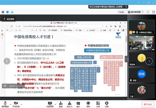 为了贯彻落实国家发展和改革委员会、教育部、工业和信息化部、人力资源和社会保障部、农业农村部、国务院国有资产监督管理委员会、中国共产主义青年团中央委员会、中华全国妇女联合会等部门联合印发的《关于深入实施创业带动就业示范行动力促高校毕业生创业就业的通知》(发改办高技〔2022〕187号)文件精神,做实双创示范基地结对共建,3月16日上午,beat365亚洲版官网与中国电信集团有限公司开展线上交流会。中国电信集团有限公司天翼创投对外孵化运营总监邵杰,beat365计算机与软件学院副院长郭雷,创新创业教育工作领导小组办公室副主任、创新创业学院副院长黄继平,计算机与软件学院部分教师代表参加了线上交流会。