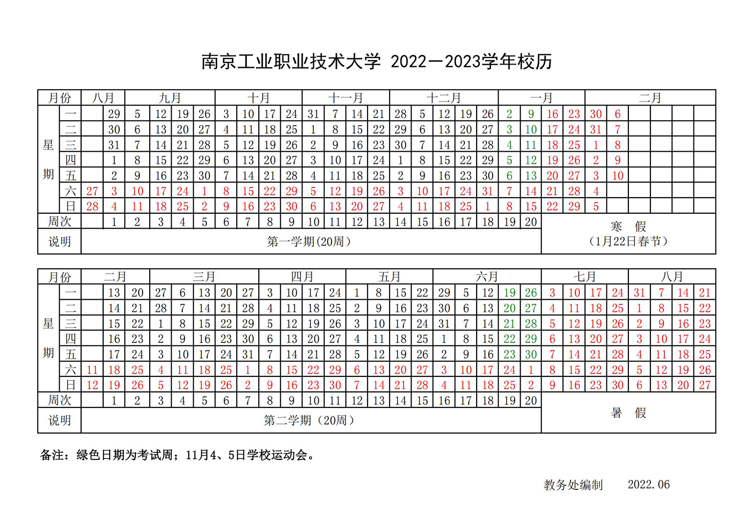 2022-2023学年校历