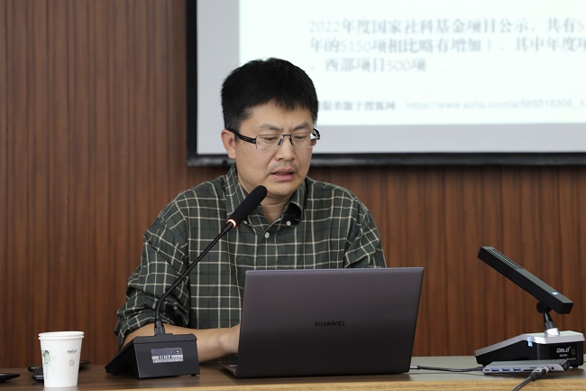 滕飞副教授以自身申报2021年度国家社会科学基金项目为例,对国家社会科学基金项目概况进行了介绍,并从选题和申报书撰写两方面进行了深入浅出的具体讲解,分别给出六点注意事项。他指出,准备研究选题和申报论证的过程中常常需要反复调研和多次论证,老师们要相信坚持是最重要的法宝,终有一天能获得科研硕果。