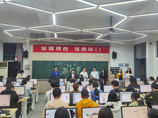 10月31日下午,博西华家用电器服务江苏有限公司高级副总裁刘禧博,中国电商销售总经理吴澄,销售业务拓展高级总监陈晓敏,电商导购总监周丽娟等企业高管一行来访商务贸易学院,看望电商专业参加“双十一”实训的同学。科技处处长孟庆杰、商务贸易学院领导班子、电子商务系教师一同来到现场为同学们加油鼓劲。