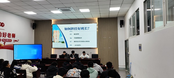 在分享环节,优秀班级干部电信2020班班长夏华兵、电信2020班团支书陈锐睿和电信2034班班长申文斌三位同学,结合自身管理班级的经验给大家做了交流。夏华兵强调班级干部想要带好班级,首先要提升自己,注重学习成绩的同时,不断提高自己的综合素质和能力,同时与同学建立良好的沟通,做同学和老师沟通的桥梁,第一时间传达信息,在如何有效推动工作方面也分别举例做了分享。陈锐睿对班级团支书所负责的 “PU口袋校园”“智慧团建”“青年大学习”这三个工作内容进行了详细的说明,并分享了他在管理班级中一些常见问题的有效解决方法。申文斌强调了班干部自身必须要起到模范带头作用,凡事都要自己做出榜样,带动班级同学一起进步,同时加强班级的学风建设,营造良好的宿舍学习氛围,最后分享了在处理班级事务当中的一些工作小经验。