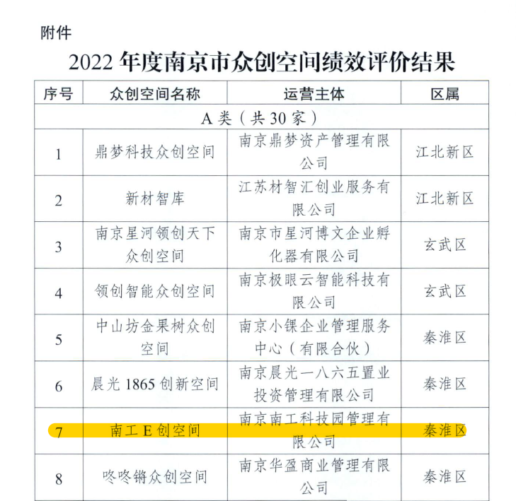 近日,南京市科学技术局发布了《市科技局关于公布2022年度市众创空间绩效评价结果的通知》(宁科〔2023〕56号),beat365大学科技园E创空间被评为“优秀(A类)”。