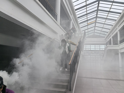 演练开始前,郑崴介绍了火场逃生七要点,包迎华做了演习动员。火灾逃生演练地点设在体育馆二楼羽毛球馆,随着烟雾迅速扩散,参演人员按照演练预案,快速有序地从消防通道疏散逃生,整个过程中大家反应迅速、沉着冷静、配合流畅,前期的演练培训和现场的疏散实践让参演人员迅速掌握常用逃生技能。