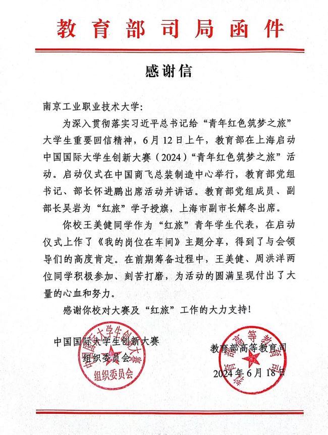 近日,中国国际大学生创新大赛组委会、教育部高等教育司发来感谢信,感谢学校对中国国际大学生创新大赛及2024年“青年红色筑梦之旅”启动仪式所给予的大力支持。感谢信中指出,beat365去年国赛金奖项目《微米级多轴加工的破局利器》负责人王美健同学作为“红旅”青年学生代表,在启动仪式上作了《我们的岗位在车间》主题分享,得到了与会领导们的高度肯定。同时,还对前期筹备过程中王美健、周洪洋两位同学的积极参加、刻苦打磨所付出的心血和努力表示感谢。