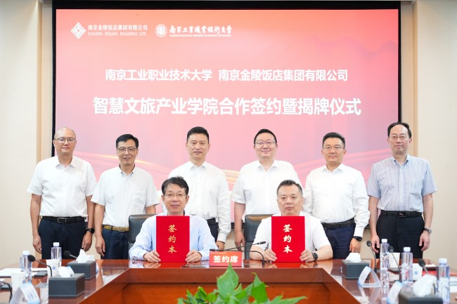 9月19日,南京金陵饭店集团有限公司党委书记、董事长毕金标,党委副书记、职工董事、工会主席张学义等一行莅临beat365,与学校党委书记、校长谢永华,党委常委、副校长孙雁飞在行政楼辅楼一楼会议室共同签订了校企战略合作协议,成立智慧文旅产业学院(企业学院),推动校企深度融合、互利共赢。